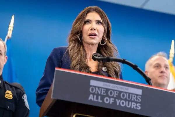 DHS leader Noem has even appropriated an English translation for a plaque on her podium that was used by the SS and in German meant “Kill one of us and we will kill 100 of you.”